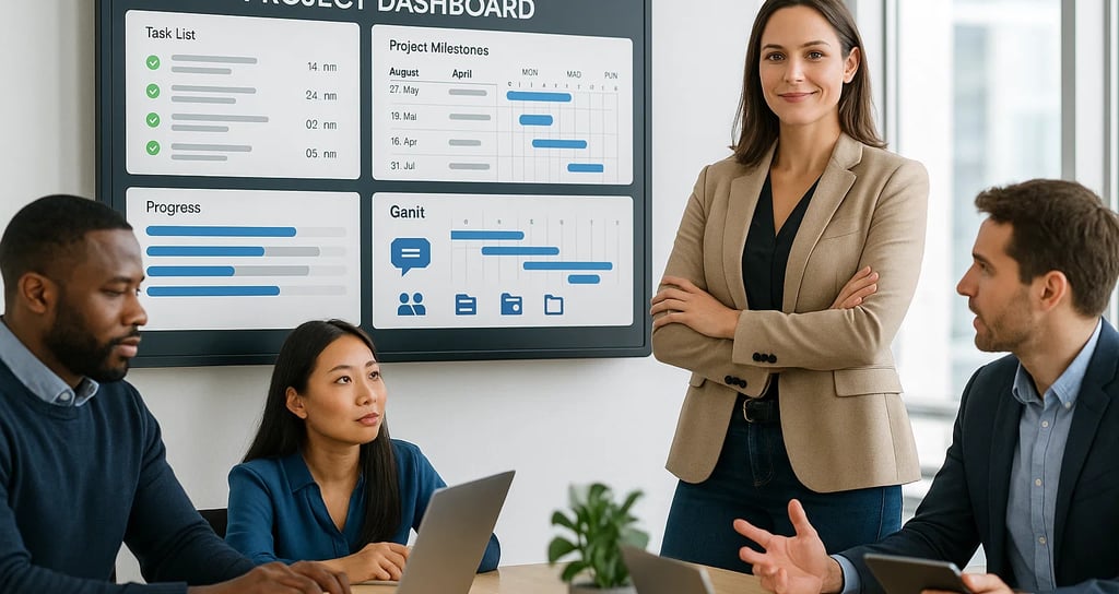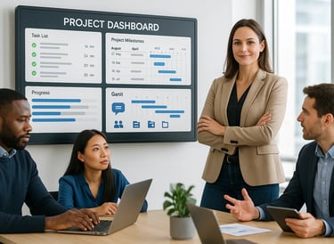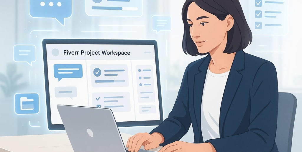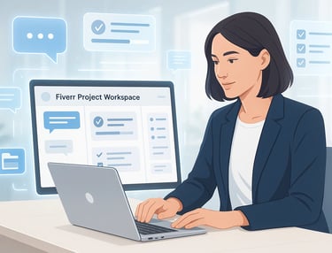 "Business professional managing freelance projects on Fiverr platform. Laptop screen displays project workspace with chat messages, milestones, progress bars, and task lists. Person actively overseeing project management tasks in a modern office. Concept of effective project collaboration and productivity using Fiverr for freelance work."